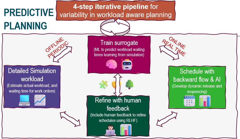 Across these themes, my objective is to develop practical, explainable, and scalable hybrid AI-supported planning tools that help organisations cope with variability, uncertainty, and increasing complexity in supply chains and production—bridging the science–industry gap and enabling resilience by design. To develop our hybrid AI planning methods, I follow a 4-step modular iterative planning appproach below.