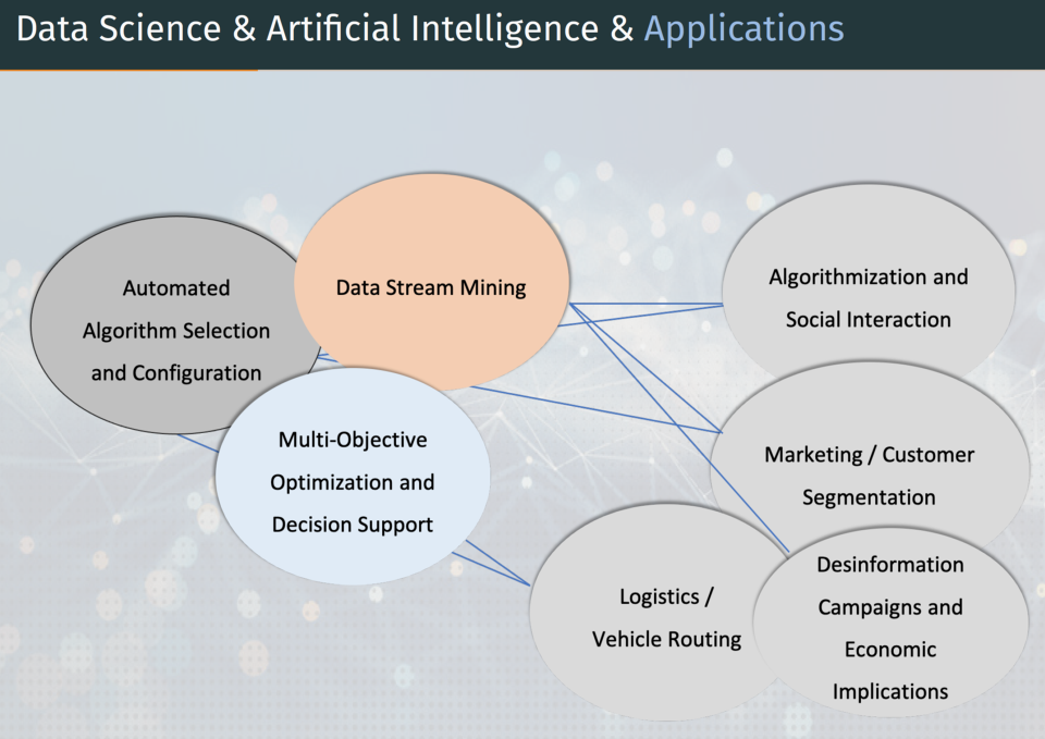 My research mainly focuses on Data Science, Data Stream Mining, Social Media Analytics, Algorithmization and Social Interaction, Automated Algorithm Selection and Configuration as well as (Multiobjective) Evolutionary Optimization.Â